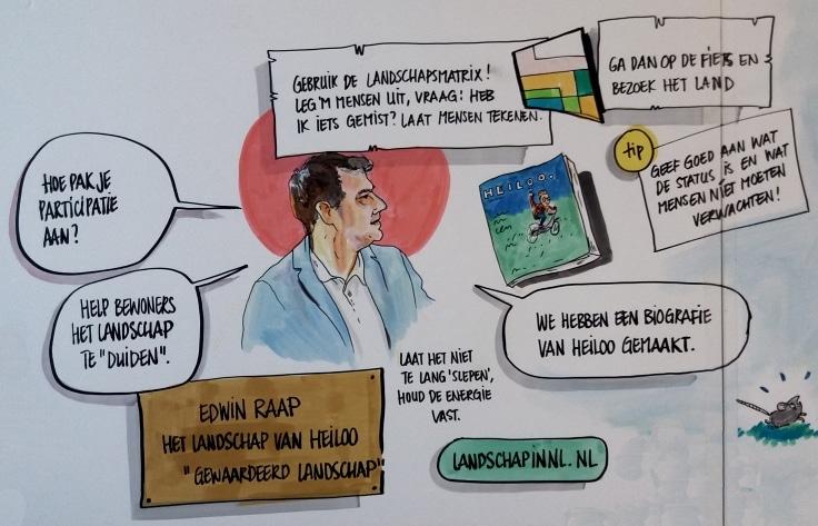 Edwin Raap van Landschap Noord-Holland belichtte een pilotproject in Heiloo, en de aanpak van participatie met bewoners en gebruikers van een omgeving. Binnen landschapsbeheer is hier al meer ervaring mee. Veel informatie over natuur, landschap en erfgoed is al online beschikbaar. De afgelopen jaren heeft de Rijksdienst voor het Cultureel Erfgoed via diverse websites veel informatie over natuur, landschap, ondergrond en erfgoed ontsloten via websites als landschapinnederland en archeologieinnederland, maar ook topotijdreis en dergelijke. Ook via Provincie Noord-Holland is veel informatie beschikbaar. Inspiratie is bijvoorbeeld te vinden in de Leidraad Landschap en Cultuurhistorie 2018.