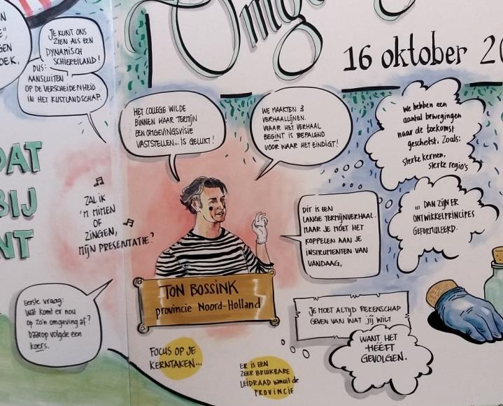 Op dinsdag 16 oktober organiseerde het Steunpunt Monumenten en Archeologie in samenwerking met de Rijksdienst voor het Cultureel Erfgoed de cursus Erfgoed in de Omgevingsvisie. 45 mensen hadden zich aangemeld om meer over dit onderwerp te leren. De lezingen werden live samengevat door twee tekenaars. Tijdens de cursus werd ingegaan op de integratie van erfgoed in de omgevingswet die in 2021 in werking treedt. De inleiding werd verzorgd door Jef Mühren, directeur van MOOI Noord-Holland. Hij benadrukte het belang van de integratie van erfgoed tijdens het proces, in plaats van achteraf. Erfgoed ís omgevingsvisie.