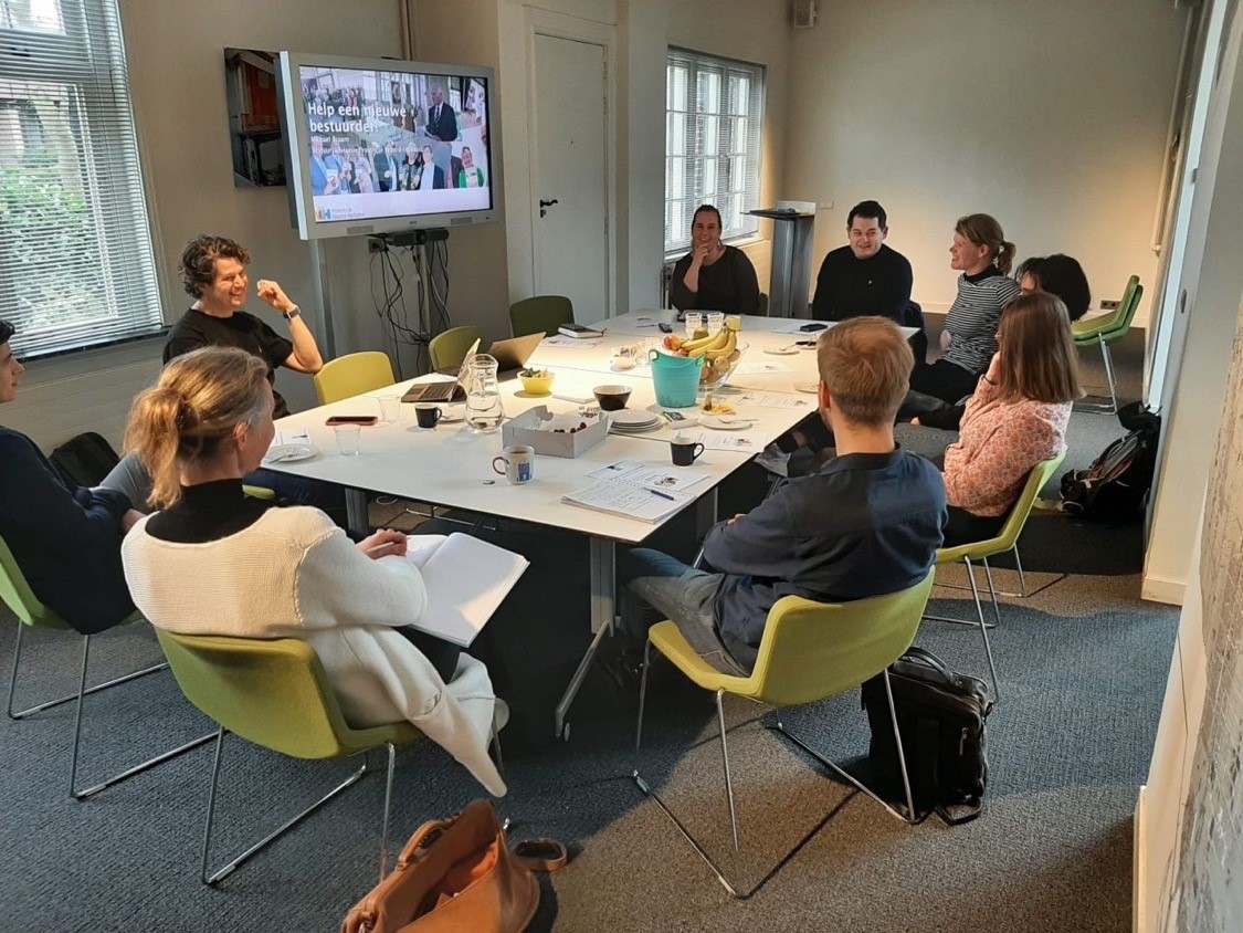 (Tekst: Marrit van Zandbergen en Sander van Alphen. Beeldverantwoording: Op de dag van de gemeenteraadsverkiezingen was bestuursadviseur Michael Braam-Scholten te gast bij het Steunpunt om met het netwerk van nieuwe erfgoedprofessionals terug te blikken en vooruit te kijken op de komende bestuurswisseling. Van links naar rechts: Michael Braam-Scholten en Janjaap Pool, provincie Noord-Holland; Marrit van Zandbergen, Steunpunt Cultureel Erfgoed Noord-Holland; Lennard Haan, gemeente Bloemendaal; Elze Belterman, gemeente Heemskerk; Lotte Portier, gemeente Hilversum; Jertske Pasman, gemeente Haarlemmermeer; Dejan Jurisic, gemeente Ouder-Amstel; Annika Blonk-van den Bercken, Steunpunt Cultureel Erfgoed Noord-Holland. Foto: Sander van Alphen)